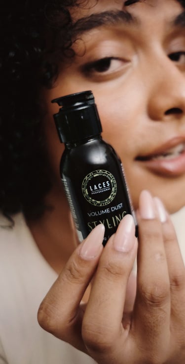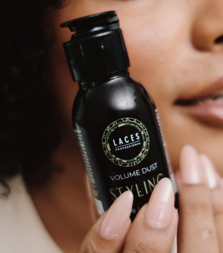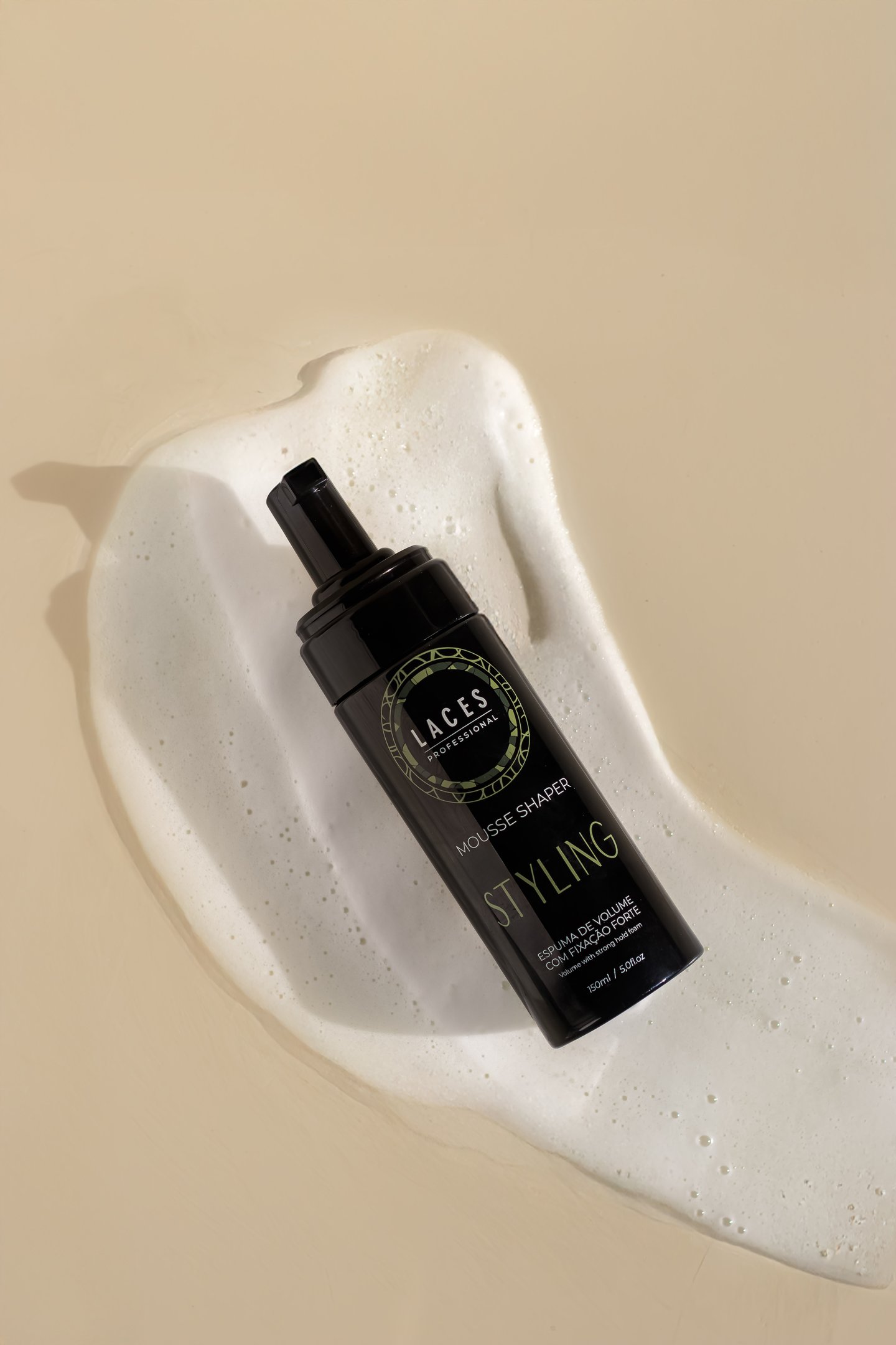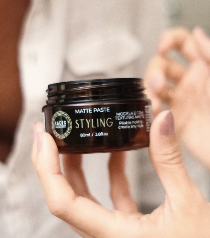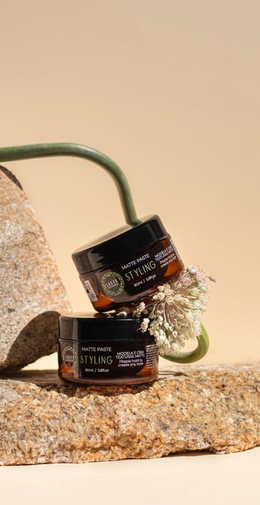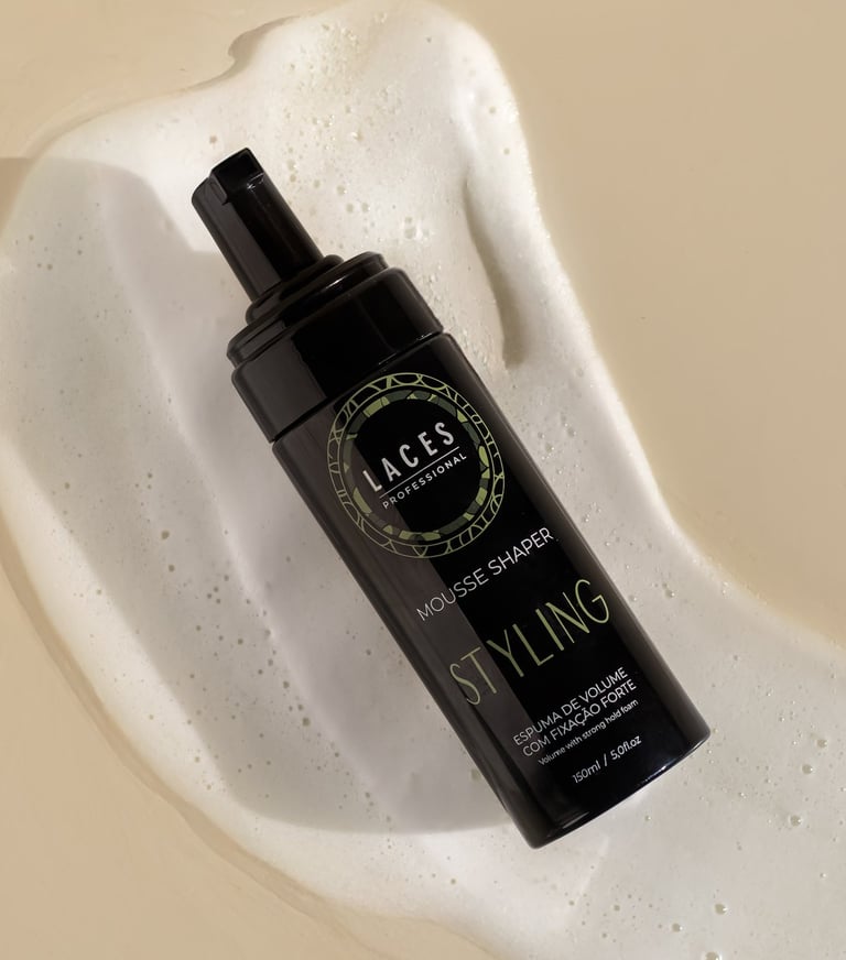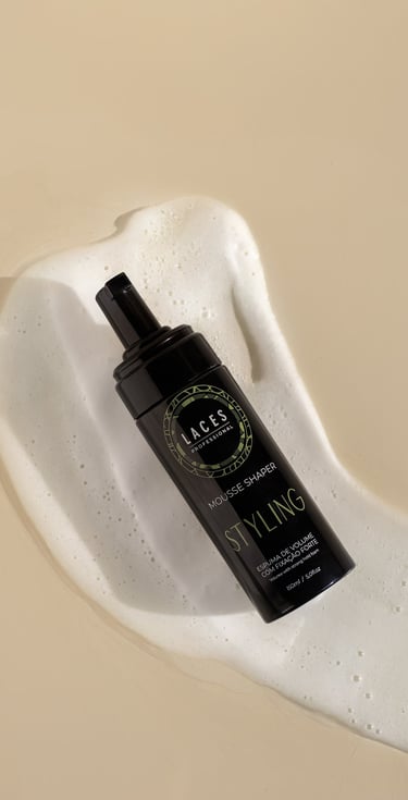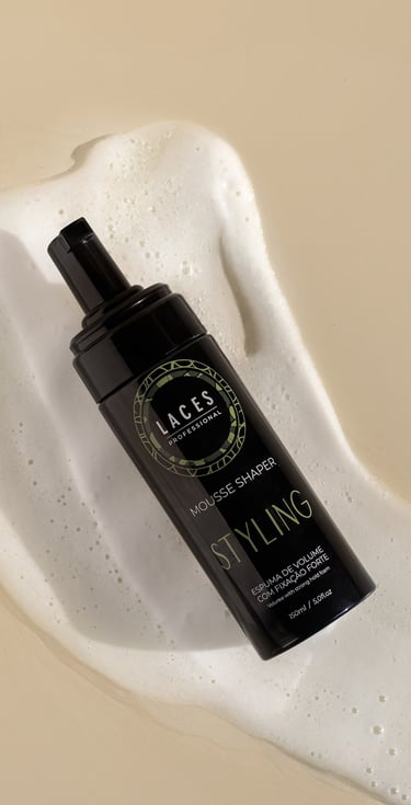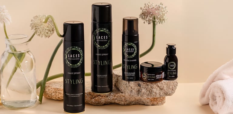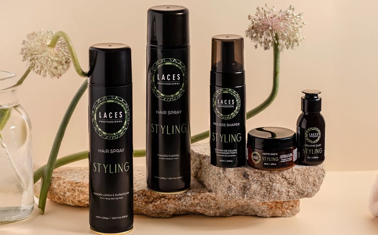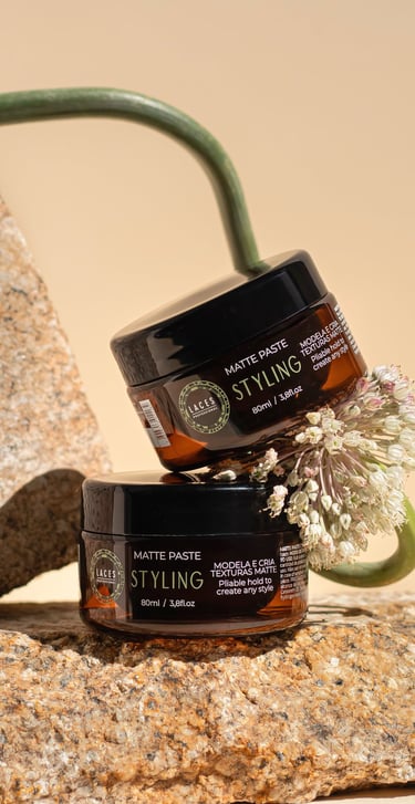 Com uma estética limpa e marcante, a linha Styling aposta no âmbar escuro como estrutura principal, referência histórica do Laces and Hair. A mandala em verde destaca a embalagem e simboliza força e sofisticação, traduzindo a performance e a personalidade dos produtos.