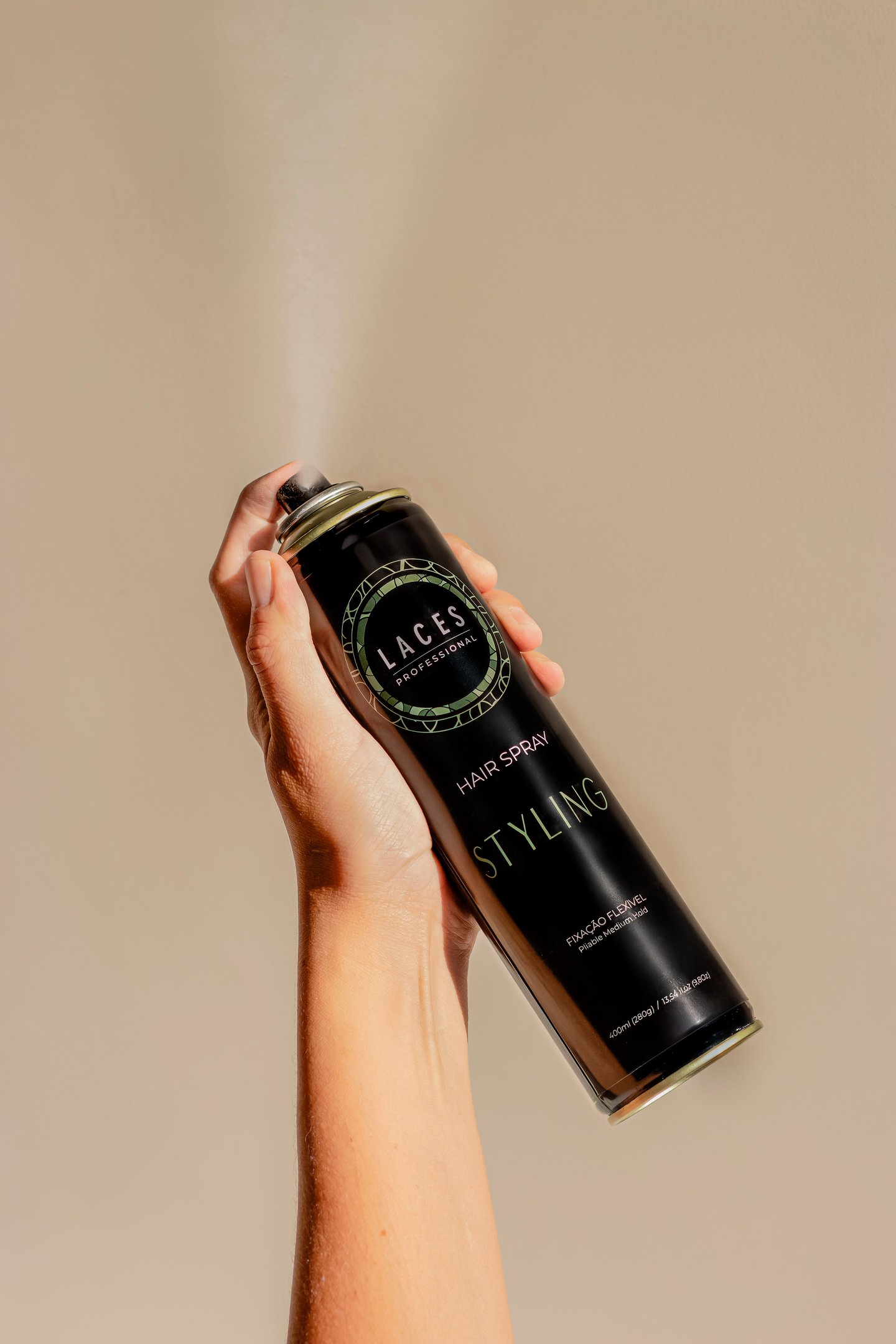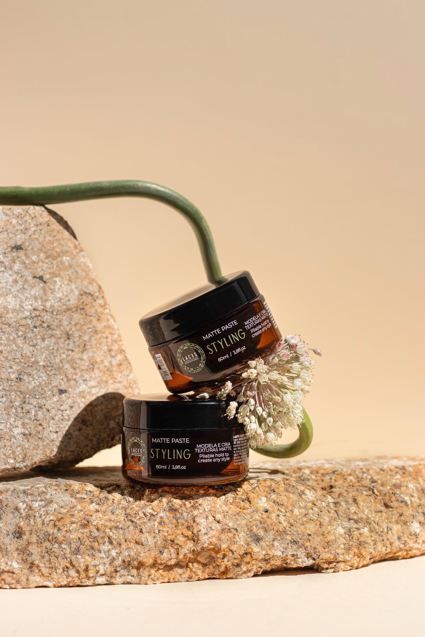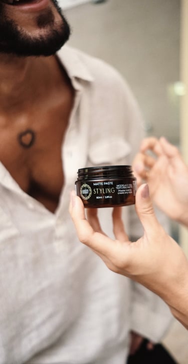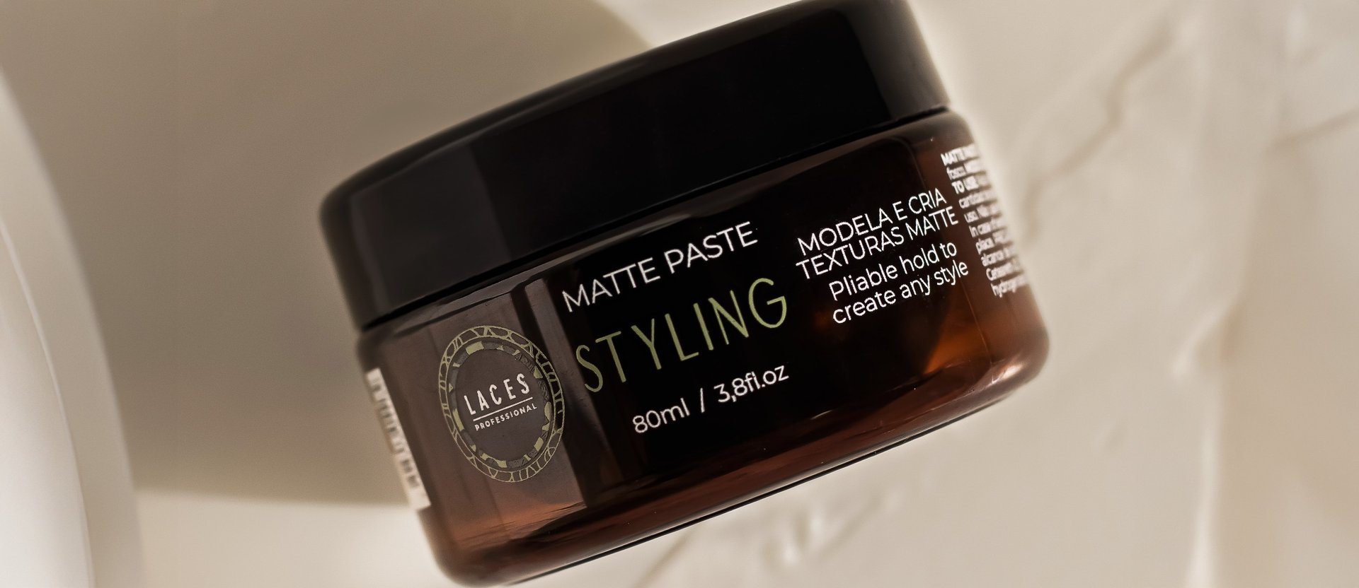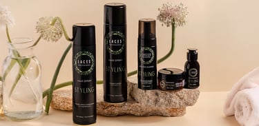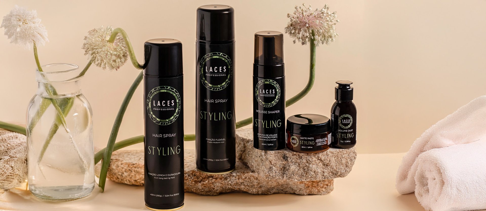 Com uma estética limpa e marcante, a linha Styling aposta no âmbar escuro como estrutura principal, referência histórica do Laces and Hair. A mandala em verde destaca a embalagem e simboliza força e sofisticação, traduzindo a performance e a personalidade dos produtos.